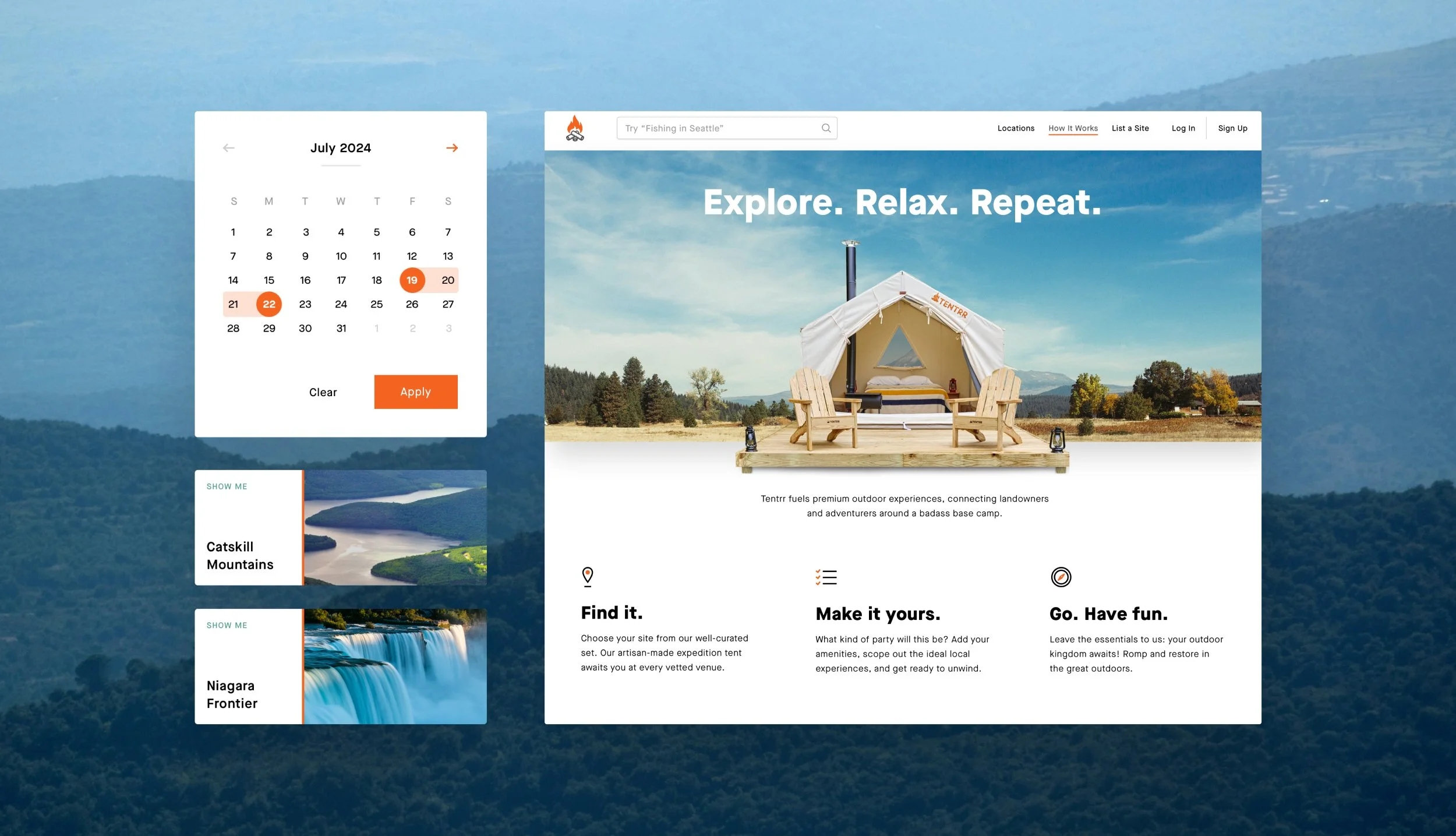Comprehensive design system and web redesign for Tentrr, a platform that enables users to discover and book private campsites.